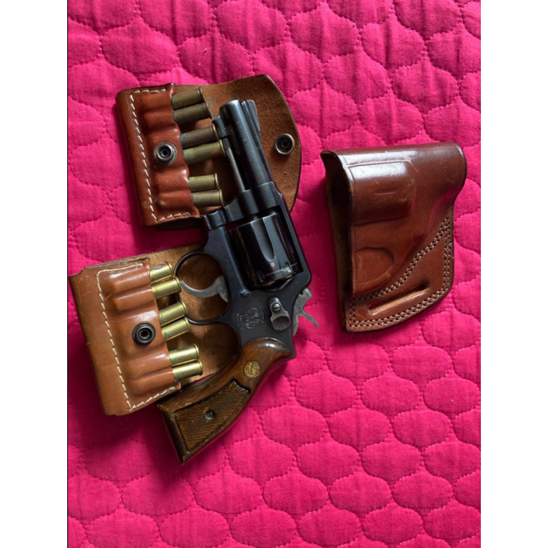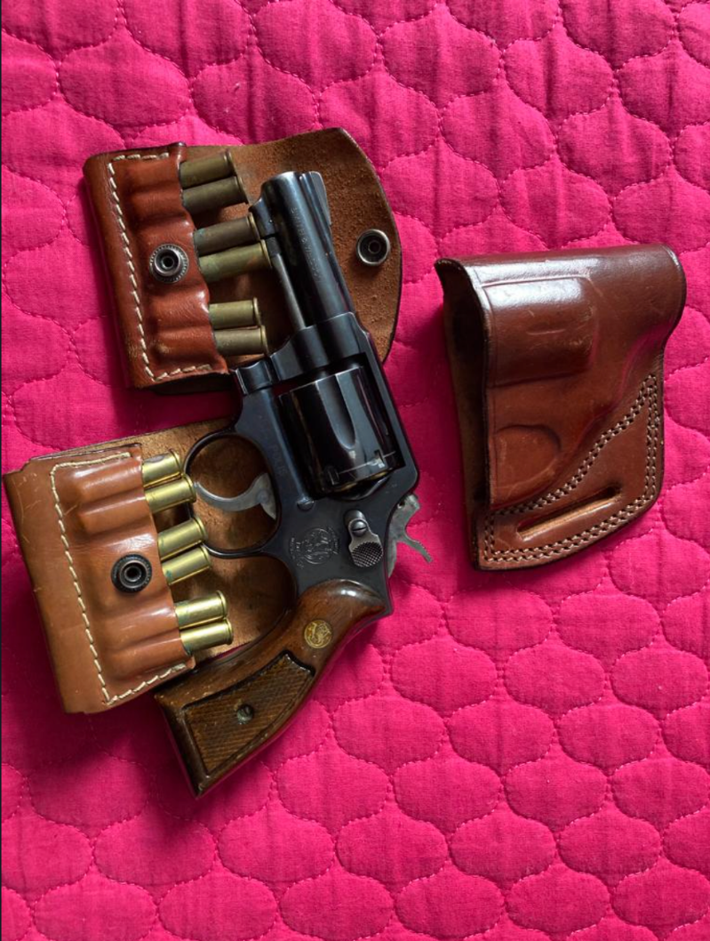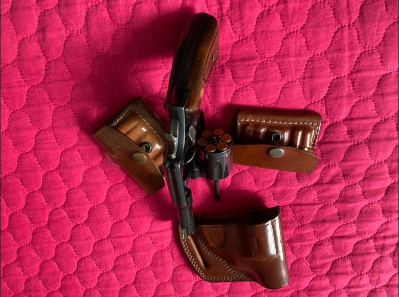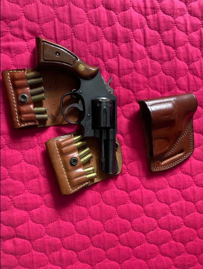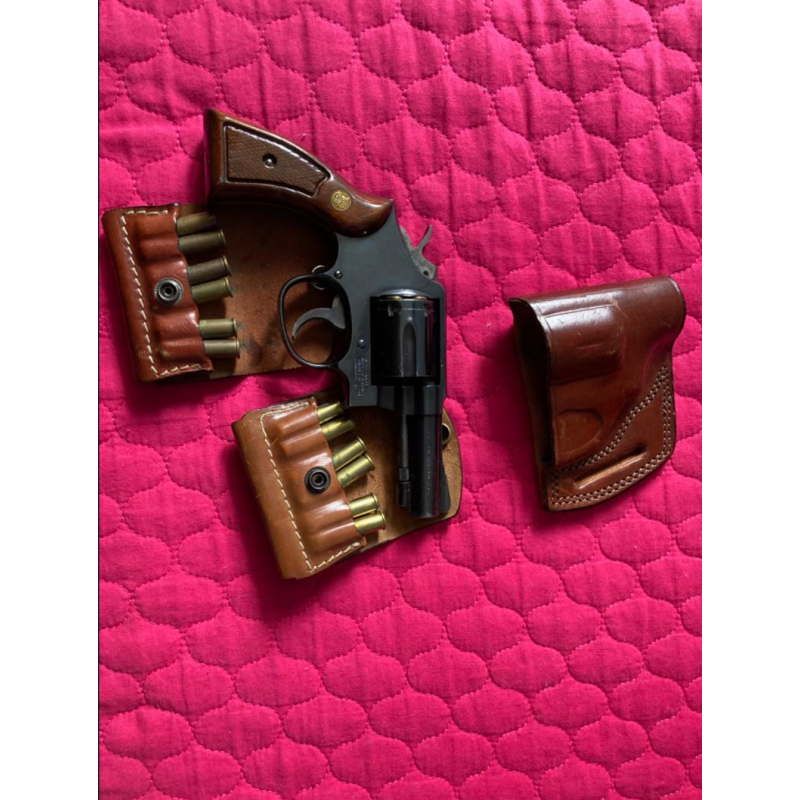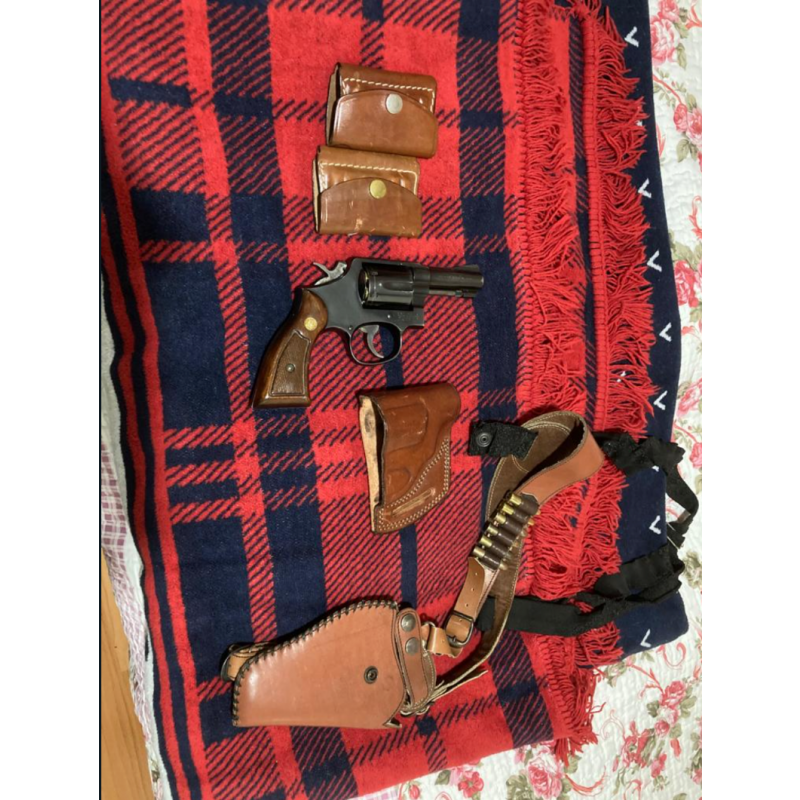 38’lik Smith wesson polis silahı. İki adet mermilik,kelebek kılıfıyla beraber.150’den fazla mermisi de var.Koltukaltı kılıfı da var ama lastikleri biraz eskimiş.