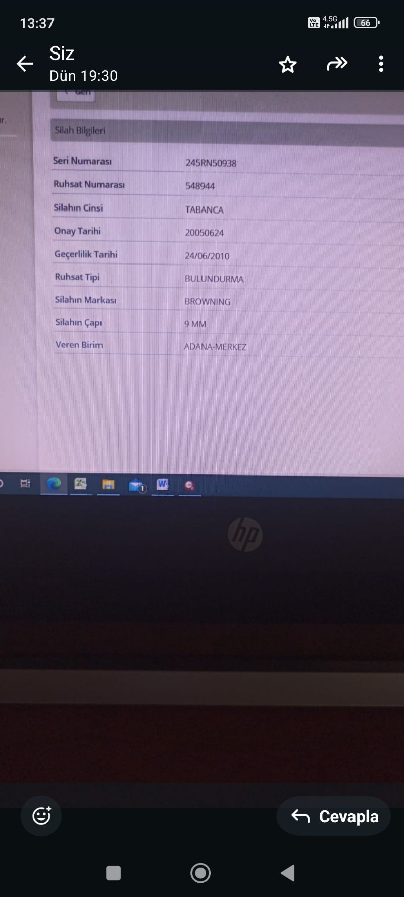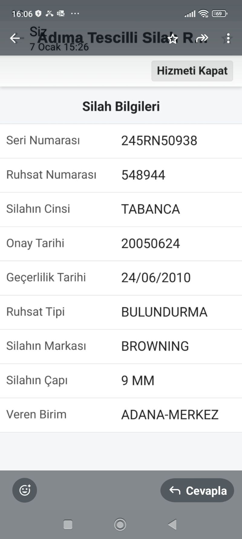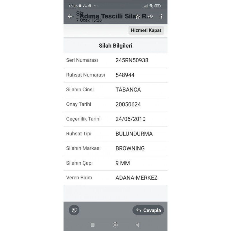 SİLAH, EMNİYETTE EMANETTE OLDUĞUNDAN RESİM KONAMAMIŞTIR. RUHSAH, RUHSAT SÜRESİ DOLDUĞUNDAN EMNİYETTE EMANETTE BORCU YOKTUR BELGESİ ALINAMADIGI İÇİN SATIŞA KONMUŞTUR SİLAHAIN KİMLİK BİLGİLERİ EKLİ DOSYADA GÖRÜLMEKTEDİR. İGİLENENLERE RUHSAT FOTOGRAFI GÖNDERİLEBİLİR.