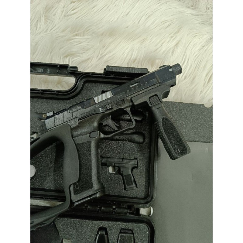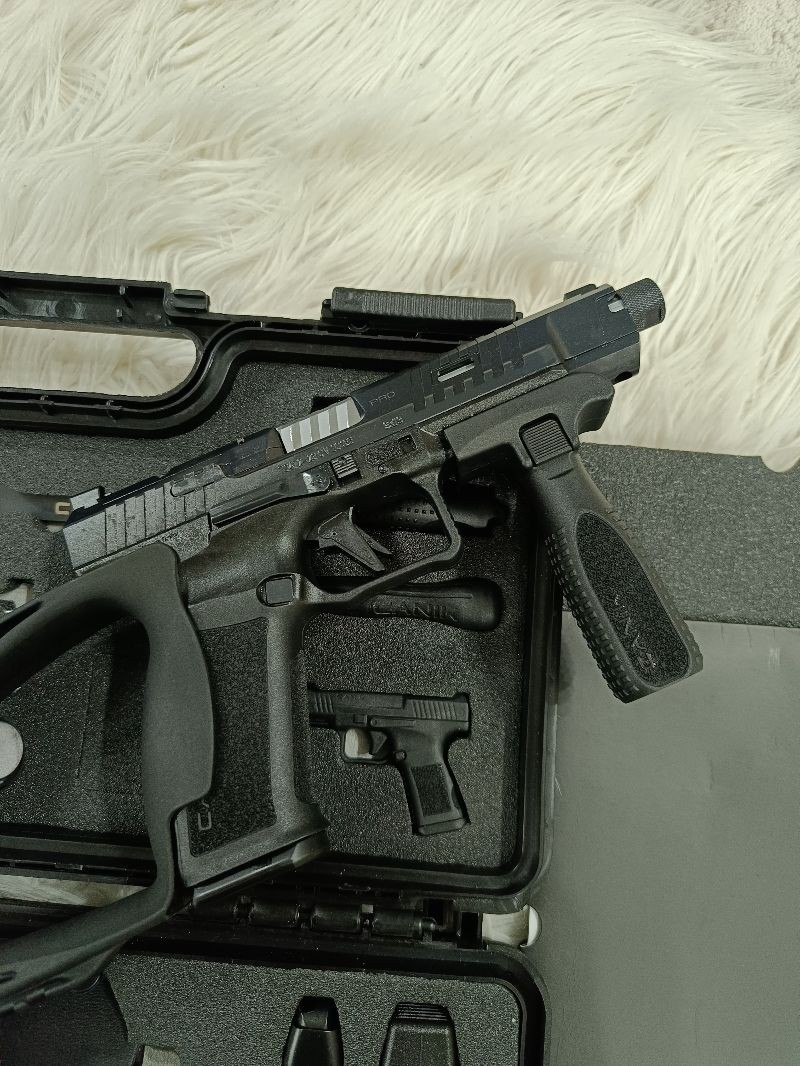 HECKLER & KOCH ün birebir yerli klonu. Tam bir performans silahı. En iyi ve özellikli yerli namlu. METE SFX PRO trityum arpacık ve düz gezden oluşan nişangah setini kullanmakta olup 146 mm(5.74 inç) kompansatör ve susturucu uyumlu oluklu krom kaplama namluya sahiptir. 90 derece tetik ile tam bir Performans silahıdır. El feneri, Red Dot gibi her türlü aksesuara uyumludur. Kilitlenebilir yeni nesil kılıf ve bir çok aksesuar kutu içeriğinde el değmemiş olarak yeni sahibini beklemektedir. Ömür boyu Canik garantilidir. Silah hakkında yazdığım her şeye kefilim. Alıcısına Şimdiden Hayırlı Uğurlu Olsun.