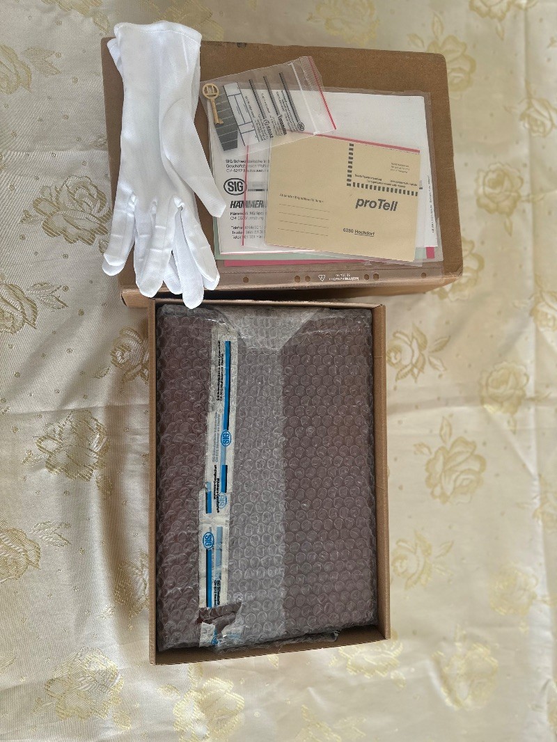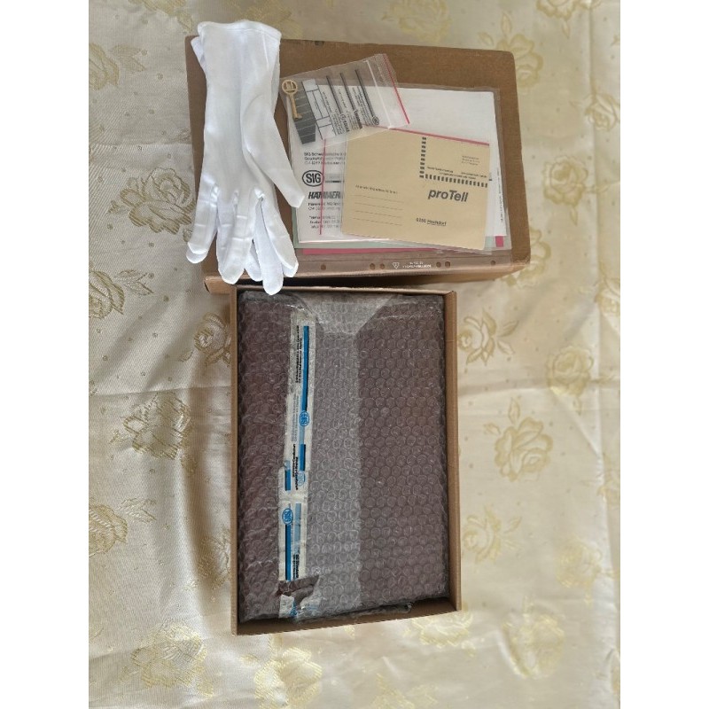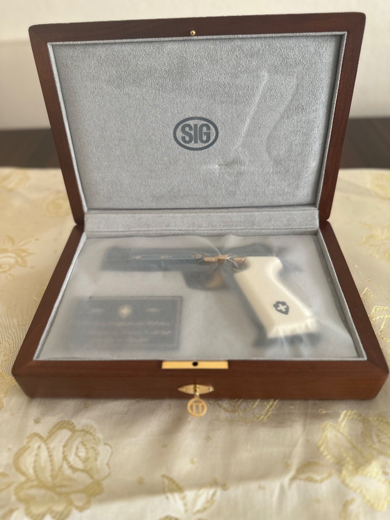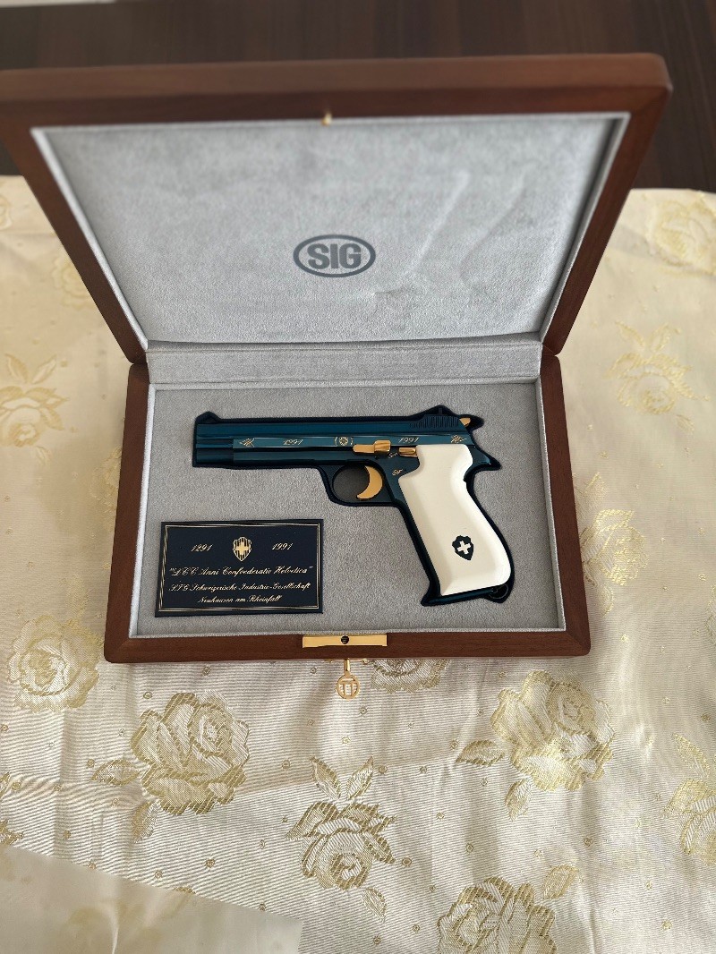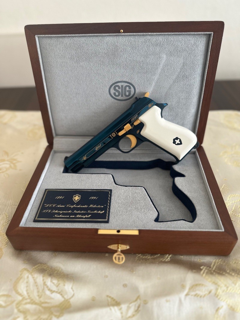 Özel seri SIG P210 Blue Helvetica.1991 yılında İsviçre devletinin kuruluşunun 700.yılına özel olarak sınırlı sayıda üretilmiş olup, şuanda üretimi bulunmamaktadır.Hiç ateş edilmemiş , sürgüsü çekilmemiş , şarjörü çıkarılmamış ve emniyet mandalı düşürülmemiştir.İlk günkü orijinalliğini korumaktadır.En ufak çizik yoktur.Orjinal ceviz kutusu kartonu ve stickerları bulunmaktadır.Ruhsat şartlarına haiz kişilerin araması önemle rica olunur.