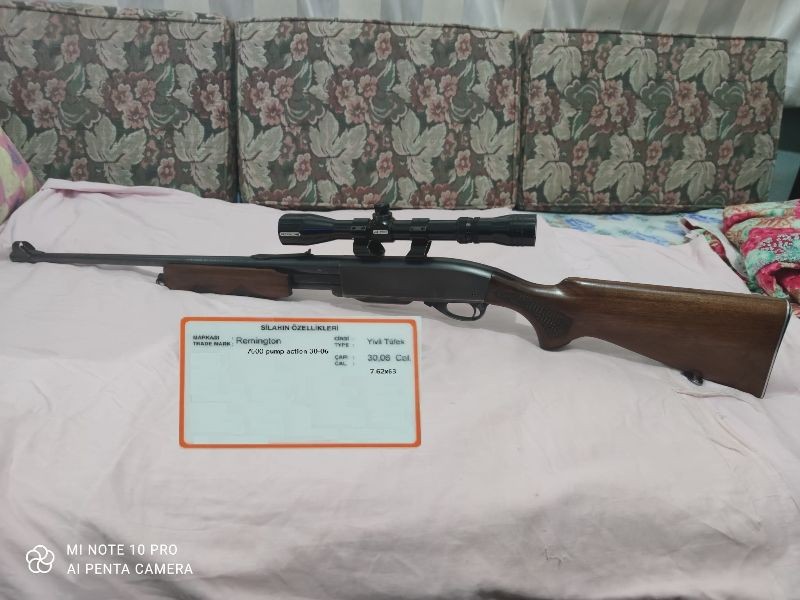 Remington 7600 pump action 30-06 kalibre 7.62×63 Pompalı yivli 4+1 bulundurma ruhsatlı Avda kullanmak için taşıma ruhsatı çıkarılabiliyor Özel dürbün ayakları sayesinde dürbün altından bakarak nişan alınabiliyor Nadir bulunan (belki Türkiye’de tek) gayet temiz bir arızası kusuru olmayan az kullanılmış bir tüfektir Paraya ihtiyaçtan satılıktır Tüfek + kılıf + dürbün + dürbün ayakları + 300 adet mermi hepsi 3900$ 0533 330 8288