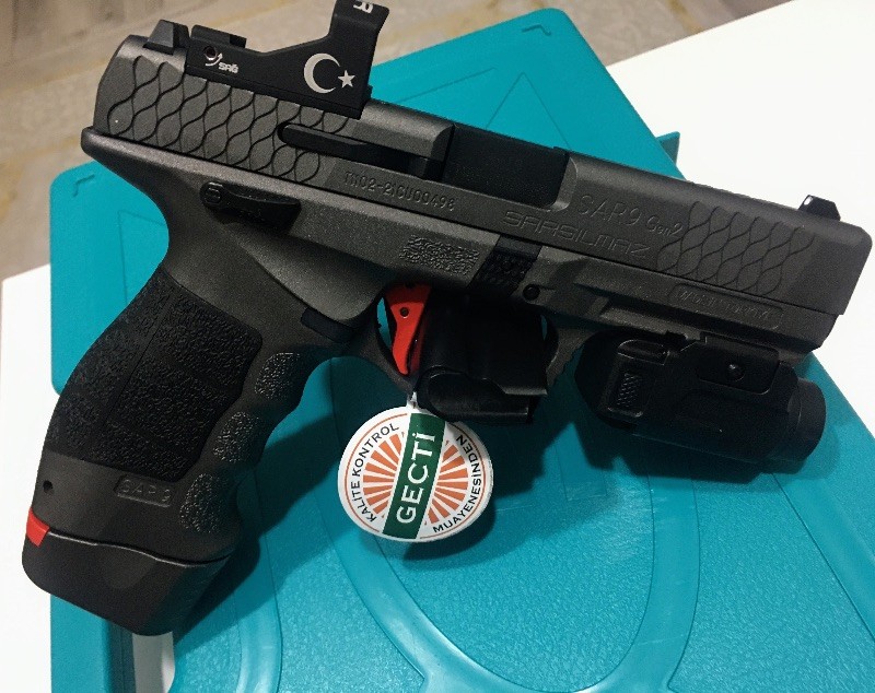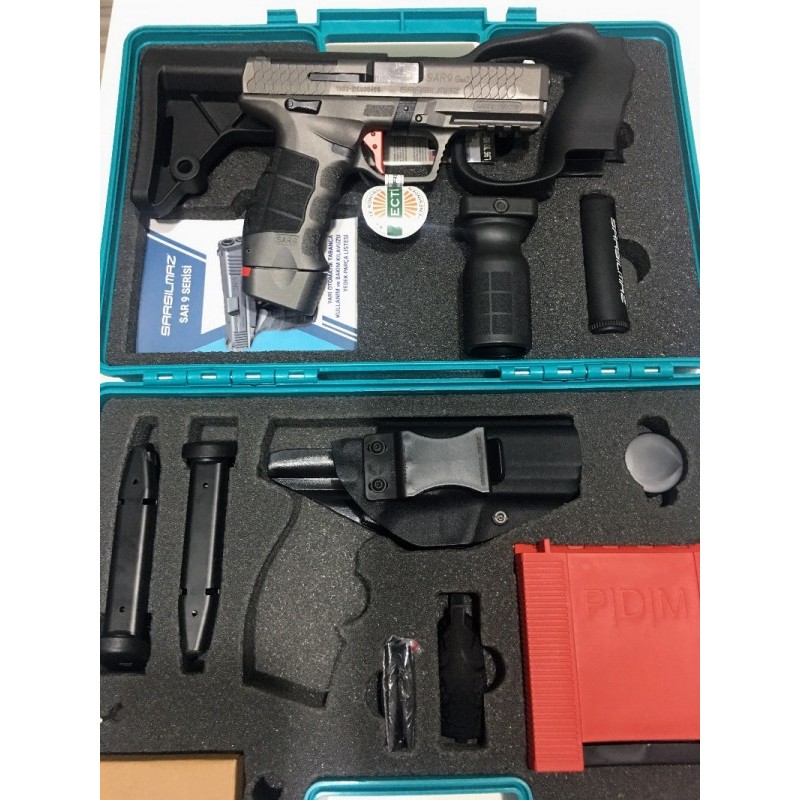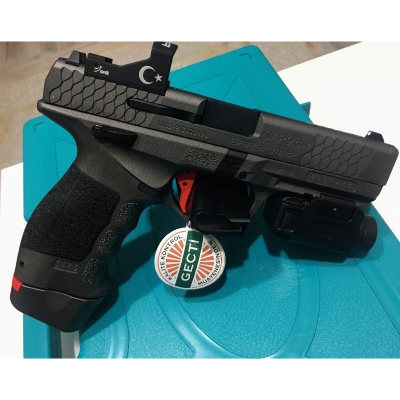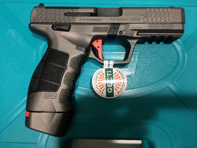 SADECE EVRAKLARI HAZIR OLANLAR İLETİŞİME GEÇSİN… Sarsılmazın Sadece 1000 adet ile sınırlı sayıda üretmiş olduğu Turkuaz Kutu Sarsılmaz Sar 9 Gen-2 Dipçikli ve Kundaklı Modelidir. Kutu İçeriğinde ; 1 Adet 19+1 Kapasiteli Ergonomik Şarjör 1 Adet 17+1 Kapasiteli Standart Şarjör 1 Adet Optik Nişangah 1 Adet Fener Bakım Kiti Mermi Basma Aparatı 3 Farklı Ölçüde Kabza Kapağı mevcuttur. Tabanca SIFIRDIR… Sarsılmaz, yarı otomatik tabanca tasarımı konusundaki uzmanlığını SAR 9 Gen2 modeliyle bir adım öteye taşıyor. SAR 9 ailesinin bu yeni üyesi; hafifletilmiş tetik, red-dot benzeri nişangâhların kullanımına olanak tanıyan kapak üzerindeki yuva ve sökülüp takılabilen yuva kapakçığı gibi yenilikler barındırıyor. Kullanıcısına farklı opsiyonlar sunan bu özellikler; optik nişangâhların kullanımının yanı sıra klasik gez ve arpacık setiyle de atış yapabilmeyi mümkün kılıyor. Ergonomik ve estetik bir tasarıma sahip olan SAR 9 Gen2, havacılıkta da kullanılan yüksek dayanımlı 7075 T6 serisi alüminyumdan üretildi. Çok daha hassas bir atış sağlayan tabancanın tetiğiyse kullanıcı talepleri doğrultusunda düz bir yapıda ve 3 farklı renk seçeneğiyle tasarlandı. SAR 9’un Gen2 sürümünde ayrıca şarjör kapasitesi de 19 fişeğe yükseltildi.