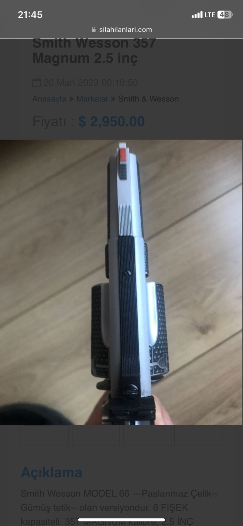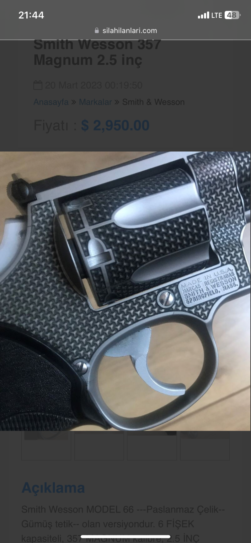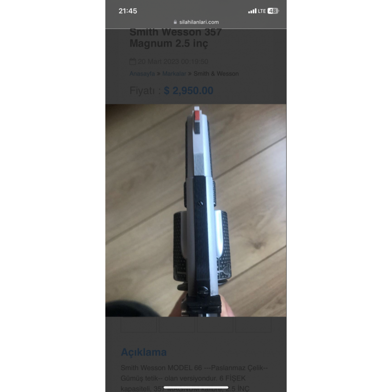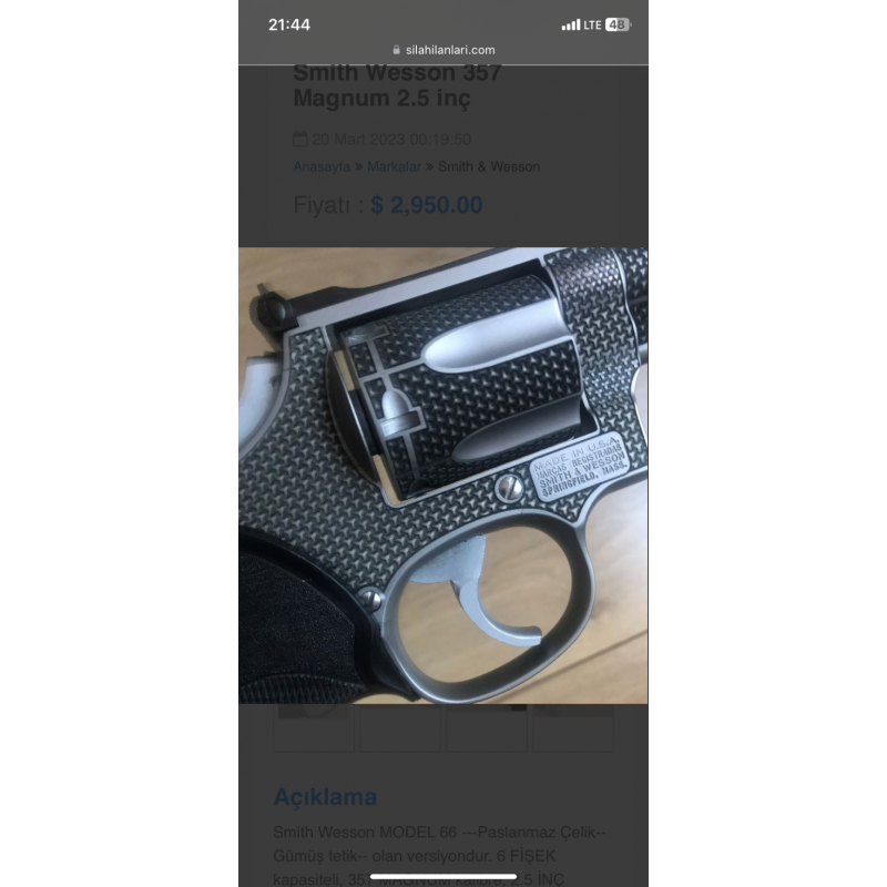 -Smith Wesson MODEL 66 -- -Paslanmaz Çelik--Gümüş tetik-- olan versiyondur. -Ayarlanabilir Gez mevcuttur. -6 FİŞEK kapasiteli, 357 MAGNUM kalibre, 2.5 İNÇ namluya sahip çok Temiz ve ÖZEL bir silahtır. -TÜRKİYE'’de sadece 2 adet vardır. -Kasada muhafaza edilmektedir. -Bulundurma ruhsatlıdır.