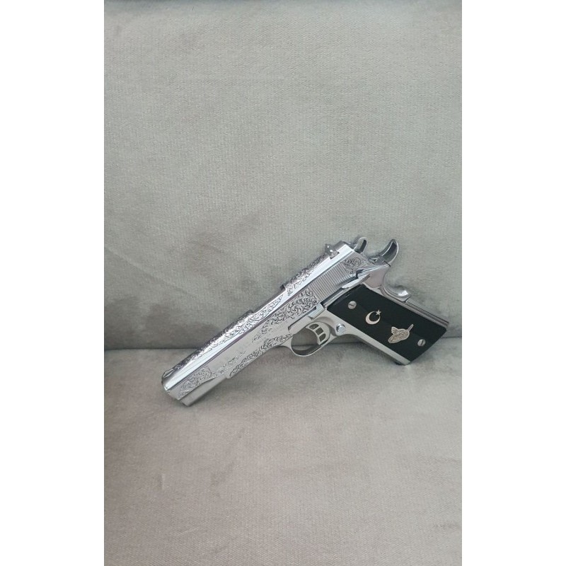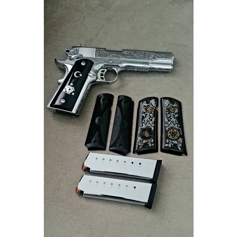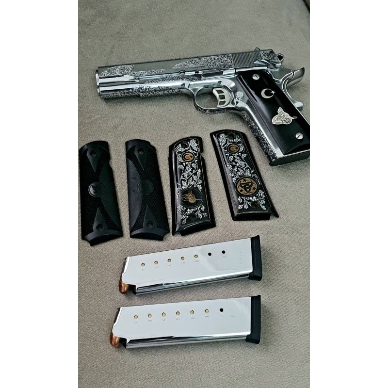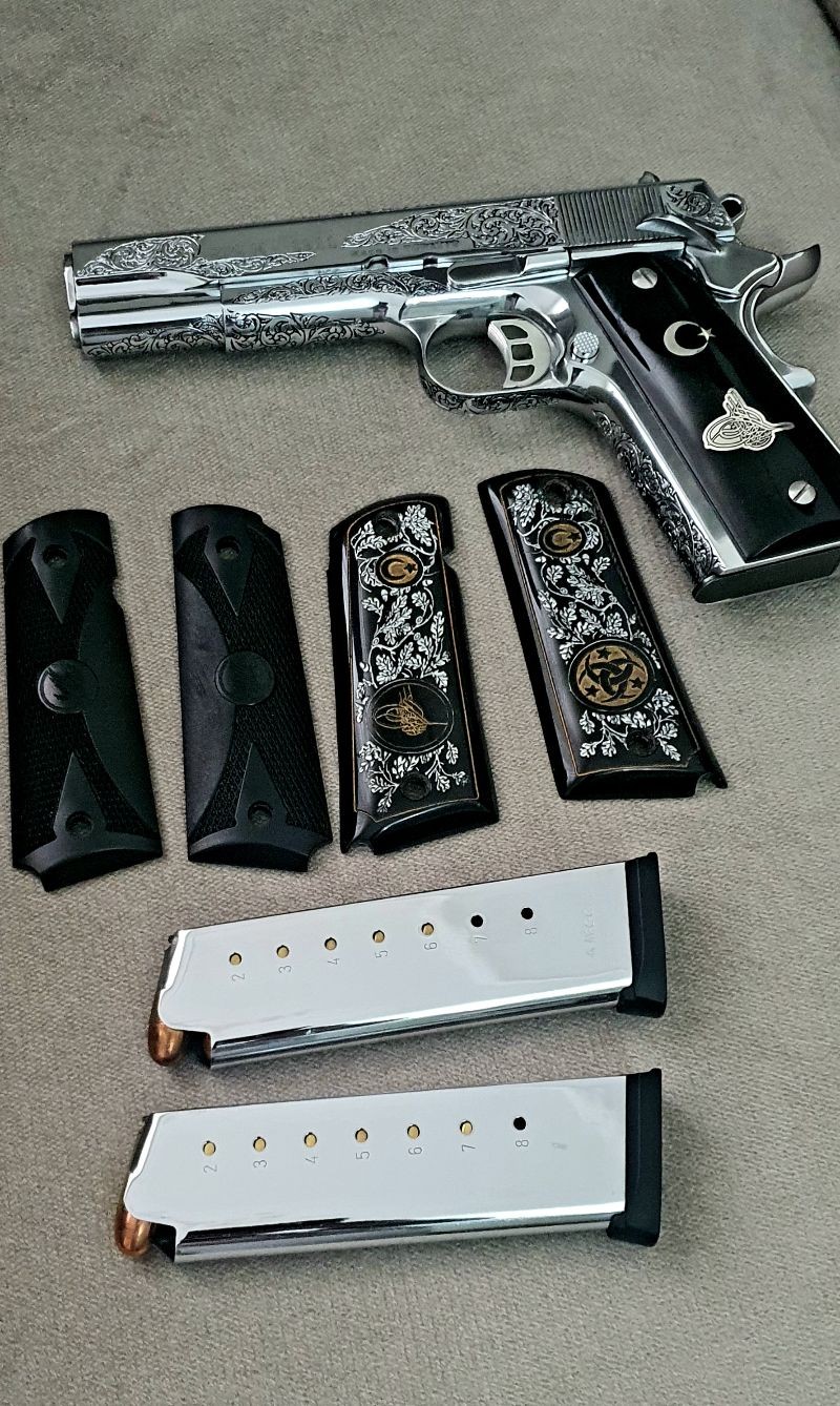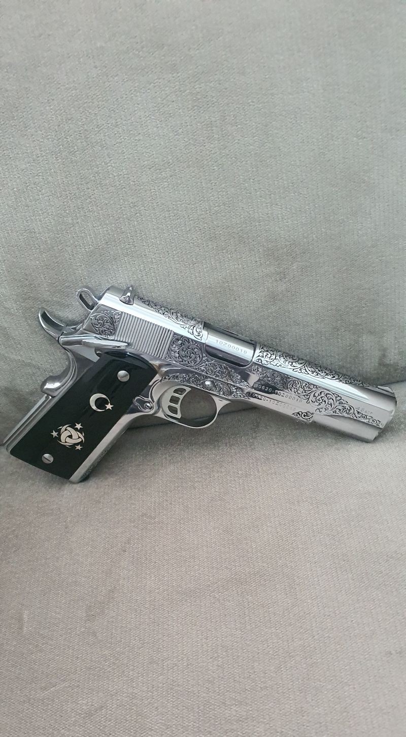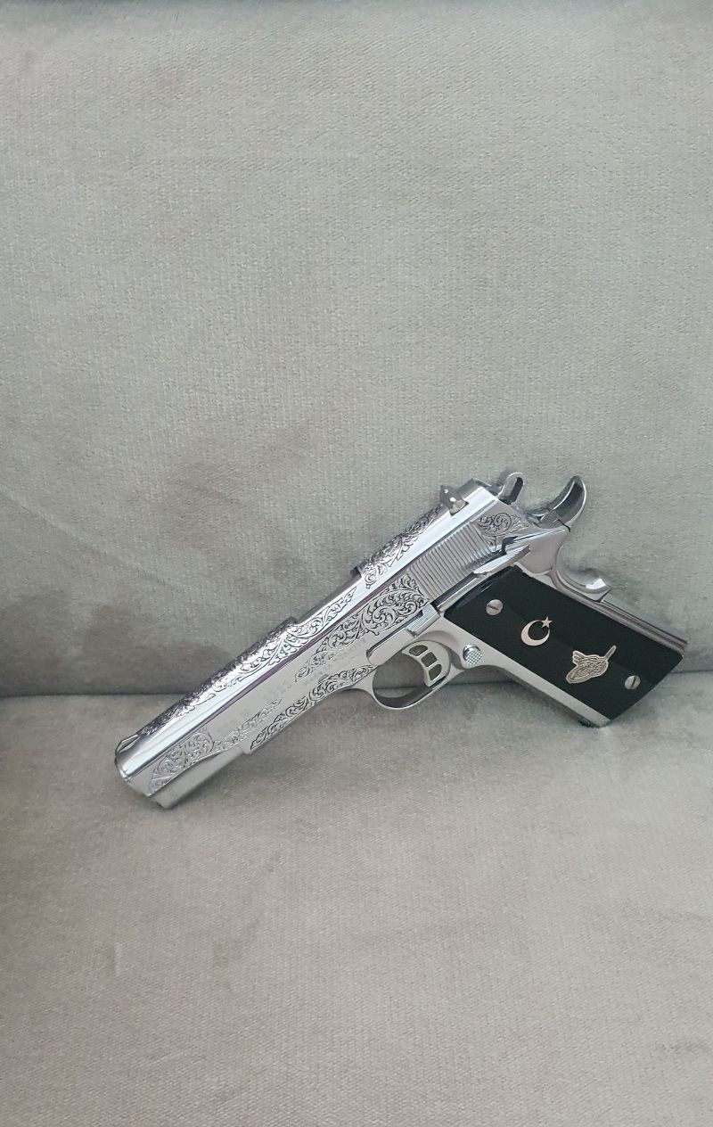 Silahım neredeyse fabrikadan çıktığı kadar temizdir. Krom kaplama ve üzerindeki gravür özel yapım el işçiliğidir. Kendi çizimlerimi gönderip kabzaları Maraş Elbistanda özel yaptırdım. Şarjörü özel aldım. Çünkü silahla gelenler görünüşünü baya bir bozuyordu.Vidalarını bile colt 1911 getirttim. Orijinal kutusu belgeleri herşeyi vardır. Şirketi devrettiğim için satılıktır. İstediğim fiyatı alamazsam bulundurmaya çevirip elimde tutacağım.