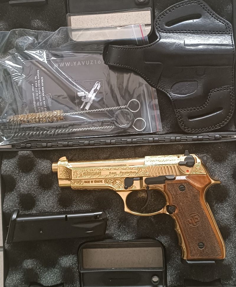 EMEKLİ KAMU GÖREVLİSİNDEN SIFIR KUTUSUNDA HİÇ KULLANILMAYAN BERETTA 92 FS KLONU YERLİ TABANCALAR İÇERİSİNDE KESİNTİSİZ 1000 MERMİ ATABİLME KABİLİYETİNE VE EN GÜÇLÜ SESE SAHİP MAKİNE KİMYA ENDÜSTRİSİ KURUMU FİATI 37.000 TL.OLAN SİLAH 25.000 TL.'YE GİRSAN YAVUZ 16 REGARD MC GOLD . (2 ADET 15+1 ŞARJÖR TABANCA KILIFI VE DİĞER TEMİZLİK MALZEMELERİ İLE BERABER.)