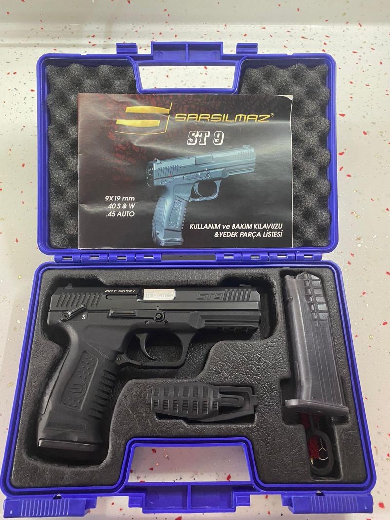 SARSILMAZ ST9 9MM Polimer gövdeli, 15+1 kapasiteli, şeffaf şarjörlüdür. yedek şarjör ile birlikte verilecektir. Çok az atış yapılmıştır. Ruhsat alma yetkisine haiz olanlar veya evrakları hazır olanlar iletişime geçsin lütfen. Gerekli evraklara emniyet müdürlüğü sitesinden bakabilirsiniz.