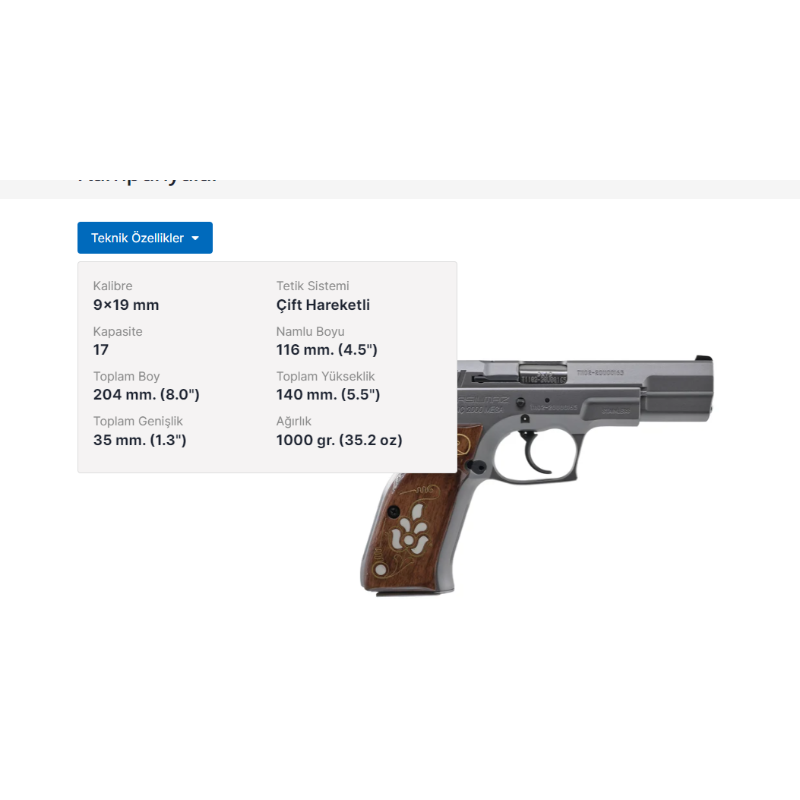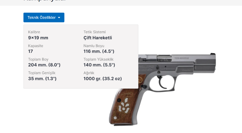 MODEL SAR 9 KALİBRE 9x19 mm ÇALIŞMA MEKANİZMASI Tek Hareketli KAPASİTE 15 NAMLU BOYU 113 mm TOPLAM BOY 193 mm TOPLAM...